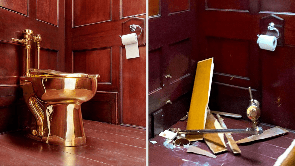 The multi-million-dollar toilet made of gold at the center of the heist was by Italian conceptual artist Maurizio Cattelan boldly titled America (2016). At a little before 5 am on September 14th, 2019, thieves had made their getaway after removing the golden toilet from the stately home. The burglars not only stole the work of art but also caused a significant amount of flooding and damage to surrounding wood panelling, since the fully functioning toilet was plumbed into a water closet.