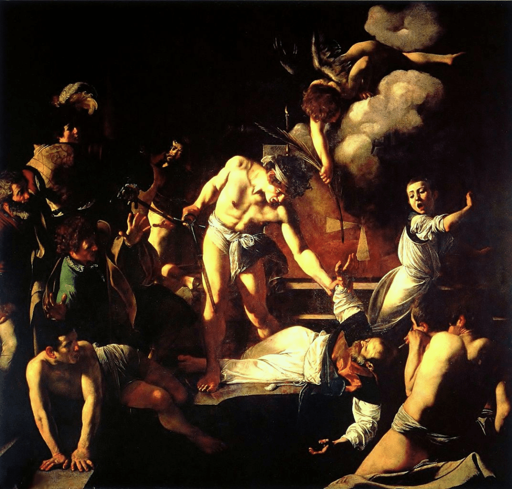 Insisting on painting real-life depictions of biblical themes, most of Caravaggio’s works were high-drama, brooding, and vulgar scenarios that shocked the public. The first of his gory depictions was Judith Beheading Holofernes, in which Caravaggio represents his interpretation of the moment Judith decapitates the intoxicated Assyrian general Holofernes. While there have been many depictions of that theological scene where Judith is represented as beautiful and pure, what makes Caravaggio’s version powerful is the expression on Judith’s face – an uncertain look that was equally irritated and repulsed. Caravaggio studied the sudden reactions of the people around him, giving him this ability to capture a level of authenticity often unseen before. Judith Beheading Holofernes was just the beginning of Caravaggio’s visceral biblical representations. He would paint David with the Head of Goliath and The Beheading of Saint John the Baptist – both of which depict scenes as their titles imply. In Doubting Thomas, we see the scene from the bible in which Thomas doubts the resurrection of Jesus Christ. With incredible detail, Caravaggio painted Jesus guiding Thomas’s unquestionably dirty finger into his open wound. Using his emblematic chiaroscuro technique, much of the light illuminates around Jesus, drawing attention to the intensity and depth of the gaping laceration in his torso.