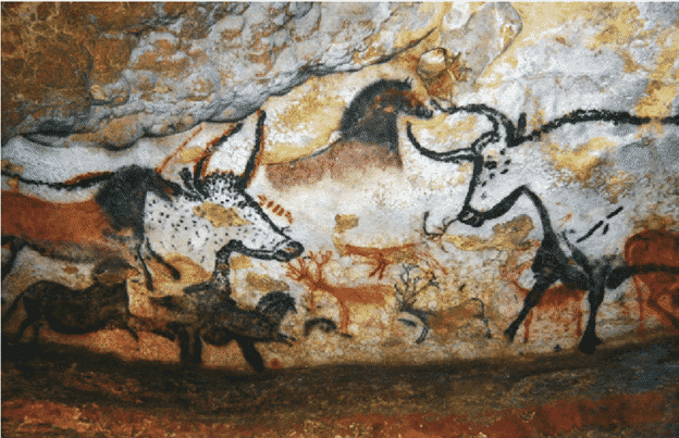 One of the first colors used in art, black has been around since prehistoric times. The Lascaux Cave in France, featuring cave drawings of paleolithic artists between 17,000 and 18,000 years ago, contains shapes of bulls, humans, other animals, and abstract symbols outlined by charcoal. Later on, the black color was obtained by burning bones or through powder of manganese oxide.