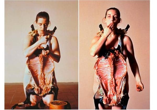 Tania Bruguera is a Cuban performance and installation artist. Her work is explicitly political, protesting against Castro’s totalitarian rule. In one of her most famous performances, she stood naked with a slaughtered lamb hanging from her neck and ate soil mixed with salt and water for 45 minutes. The piece was called Burden of Guilt; Edward Rubin describes it as a reminder that “freedom, liberty and self-determination are not abstract ideals, but achievements that deeply inscribe their meaning on our physical being.”