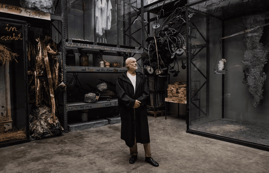 Anselm Kiefer checks over the installations in his show in 2023. Photograph: Sarah Lee/The Guardian | Source: theguardian.com