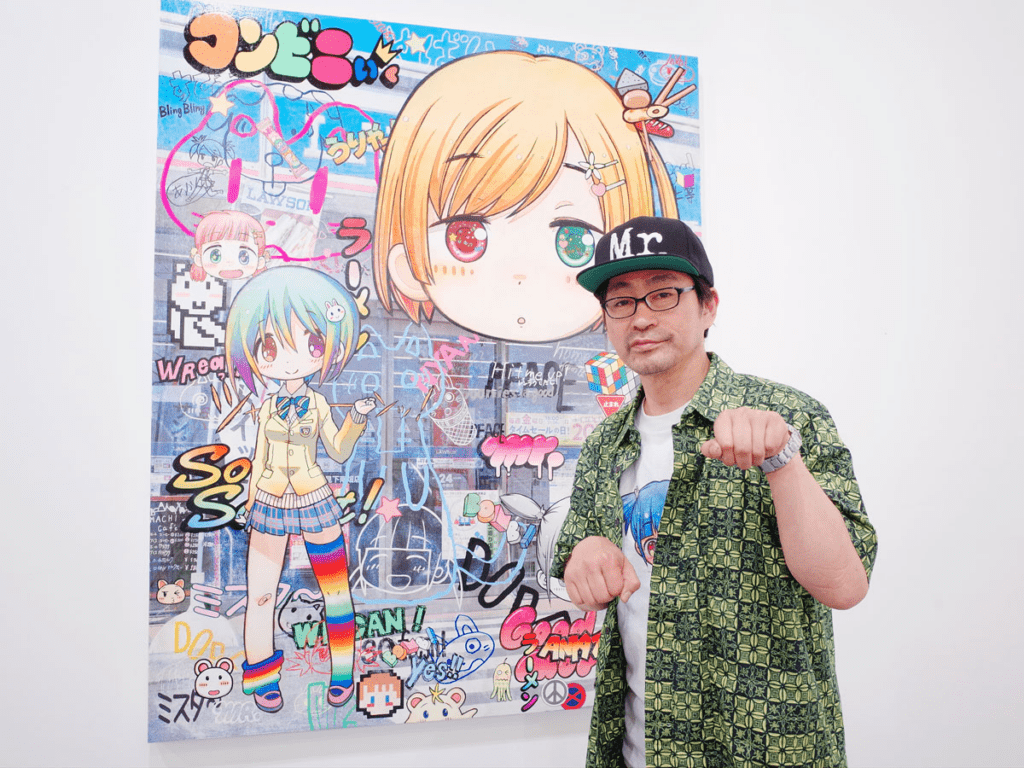 Japanese artist Mr. (née Masakatsu Iwamoto) a protégé of Takashi Murakami, in front of his painting from the exhibition “Sunset in My Heart” | Image source: Timeout.com and photo by Teddy Wolff