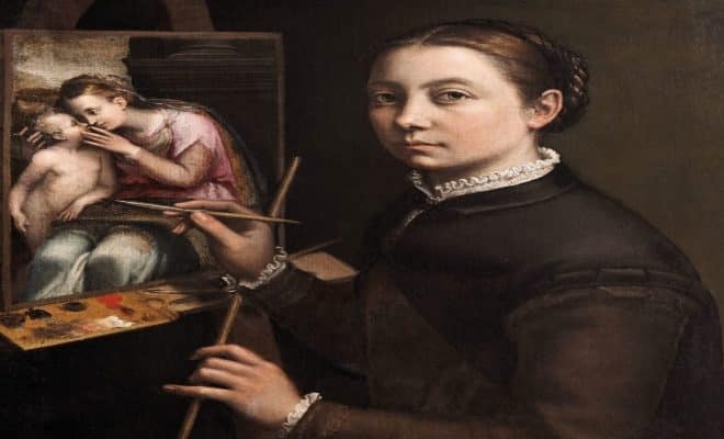 Sofonisba Anguissola, Self-Portrait at the Easel (around 1556–57). Courtesy the Castle Museum in Łańcut. | Image source: news.artnet.com