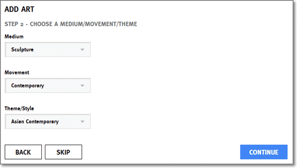 Not interested in cataloging your artwork? Simply skip this step by hitting the “skip” button (you can always come back to it).