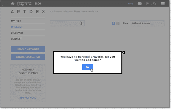 If this is the first time you’re uploading artwork, a message prompting you to add some will pop up. Just click “OK” to continue.