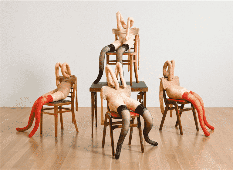 Sarah Lucas, who was known for her sculptures made from fresh food, cigarettes, and women’s tights, would go on to be described in the Guardian in 2011 as “the wildest of the Young British Artists, partying hard and making art that was provocative and at times genuinely shocking.” When asked if being a YBA has been a hindrance or help in her career, she answers, “I just accept it. You know it gets a bit ridiculous now we are in our 50s.”