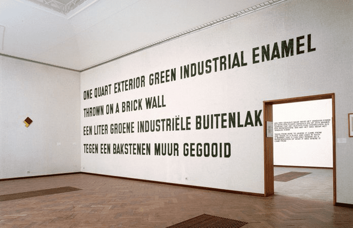 Following Weiner’s beliefs, the lettering wasn’t always done by him and often done by a painter with a stencil; what was important was that it complied with his instructions. But what set Weiner apart were his epigrammatic statements, starting with his One Quart Exterior Green Industrial Enamel Thrown On a Brick Wall (1968) and Removal to the Lathing or Support Wall of Plaster or Wallboard From a Wall (1968).