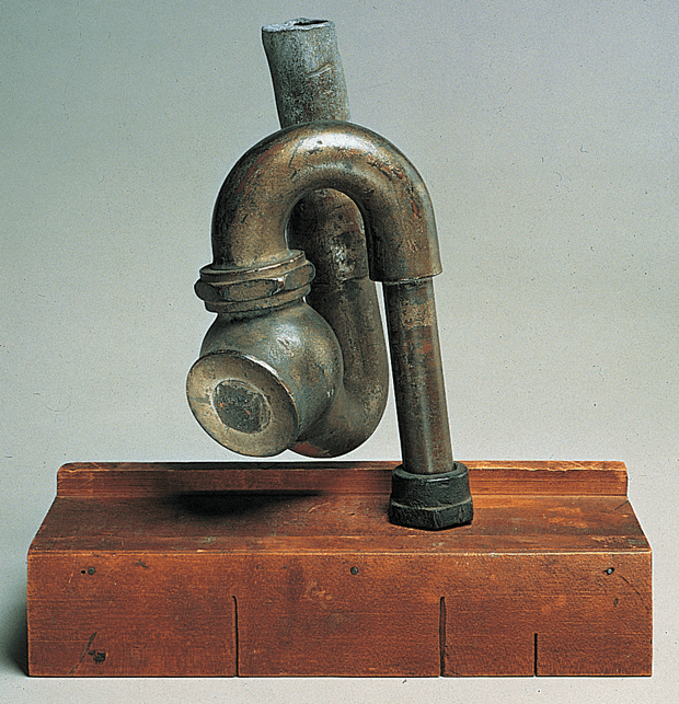 The Baroness’ Enduring Ornament (1913) was a rusty iron ring, while her God sculpture (1917) consisted of a cast iron drain trap. In 1918, The Baroness found a piece of scrap wood with jagged lines, mounted it on a simple piece of construction wood, and named it Cathedral. And between 1917-1918, Baroness Elsa mounted a discarded metal spring, curtain tassel, and wire on wood, calling the sculpture Limbswish.