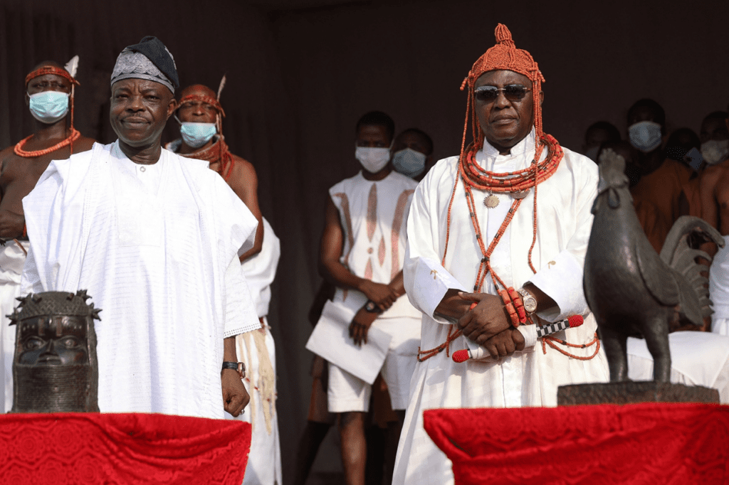 Sarafadeen Tunji Isola, Nigeria’s high commissioner to the United Kingdom, (left) and Ewuare II, Oba of Benin, king of the Edo people, receive repatriated artifacts that were looted from Nigeria more than 125 years ago by the British military in Benin City, Nigeria, on Feb. 19, 2022 | Source:  foreignpolicy.com