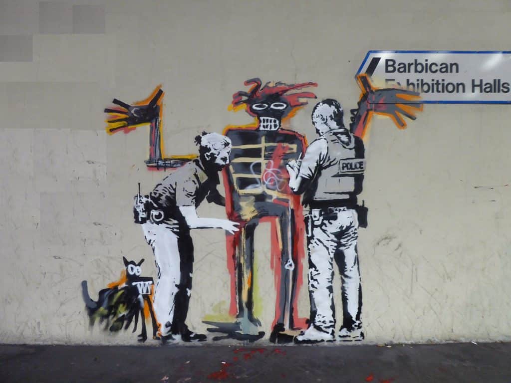 Banksy’s iconic street art, Basquiat being “stopped-and-frisked” outside the Barbican Centre, London in 2017, was a tribute to Jean-Michel Basquiat.| Image source: londoncallingblog.net