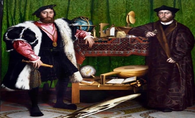 During his time in England and at the royal court, Hans Holbein portrayed merchants, landowners, royal visitors, and courtiers. He was bold in adding reminders of mortality, as evident in the painting The Ambassadors (1533). This is a double portrait of Jean de Dinteville and Georges de Selve, sent by King Francis I of France, who visited England to discuss diplomacy with King Henry VIII.