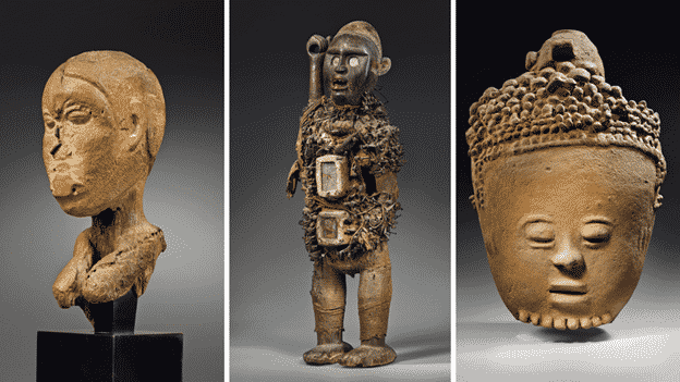 [Left to Right] Bust of Fon Priestess (from Abomey, Republic of Benin), Yombe Power Figure (from Republic of Congo), Akan Ancestral Head (from Ghana) from Christie’s Paris in 2018 | Source: robbreport.com