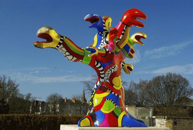 Niki de Saint-Phalle, L’arbre-serpents, a sculpture-fountain, resin and polyurethane paint, 1992, exhibited on the terrace of the Musée des Beaux -Arts of Angers. | Source: Pinterest