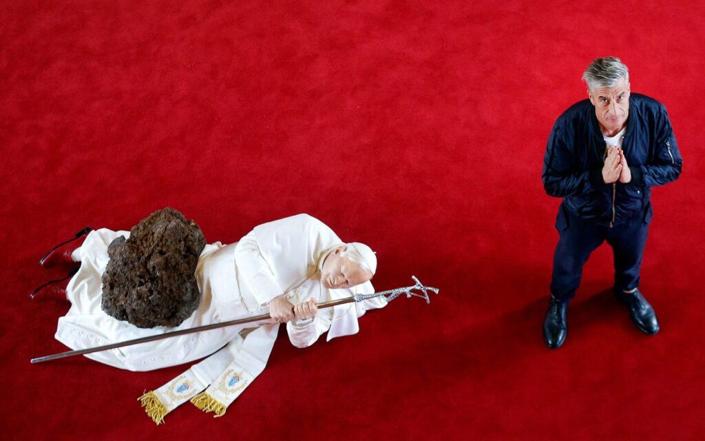 Maurizio Cattelan poses with his sculpture “La Nona Ora” (The Ninth Hour, 1999) prior to the opening of the exhibition “Not Afraid of Love” at the Hotel de la Monnaie in Paris, France, October 17, 2016. (Photo by Philippe Wojazer/Reuters) | Source: nssmag.com