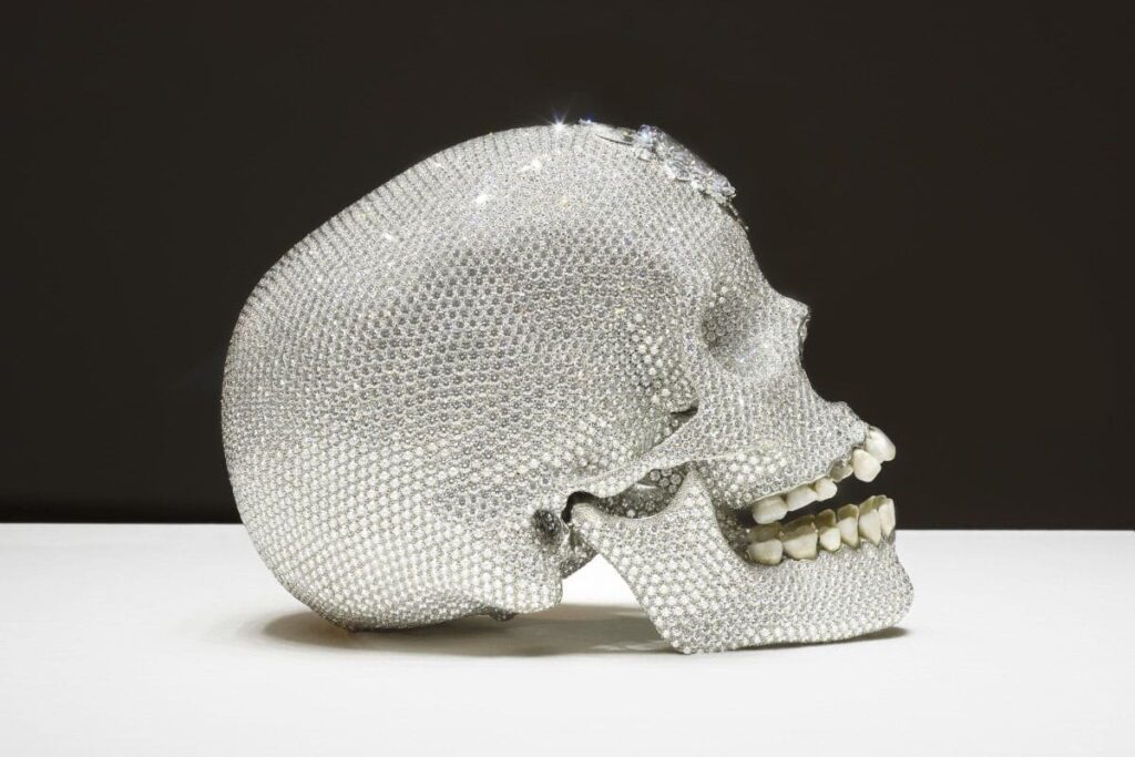 Damien Hirst’s “For the Love of God” (2007), modeled using a real human skull with diamond encrusted. | Source: widewalls.ch